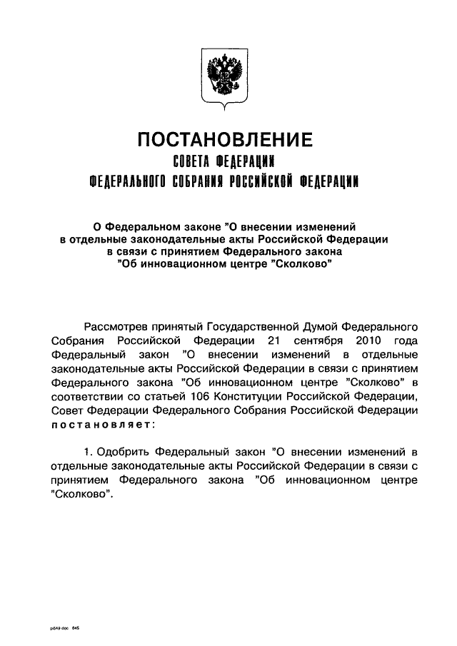 "О ФЕДЕРАЛЬНОМ ЗАКОНЕ "О ВНЕСЕНИИ ИЗМЕНЕНИЙ В ОТДЕЛЬНЫЕ ЗАКОНОДАТЕЛЬНЫЕ АКТЫ РОССИЙСКОЙ ФЕДЕРАЦИИ В СВЯЗИ С ПРИНЯТИЕМ ФЕДЕРАЛЬНОГО ЗАКОНА "ОБ ИННОВАЦИОННОМ ЦЕНТРЕ "СКОЛКОВО"