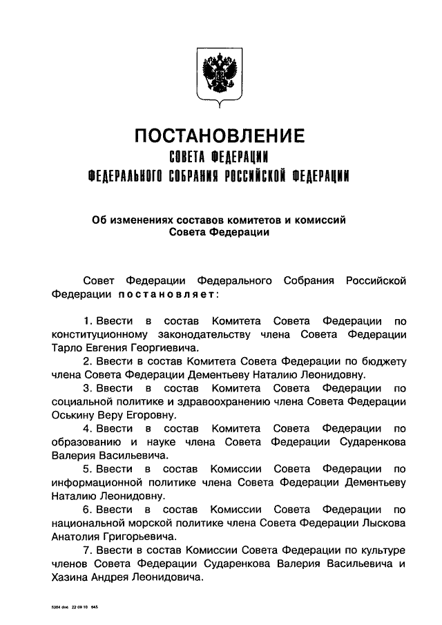 "ОБ ИЗМЕНЕНИЯХ СОСТАВОВ КОМИТЕТОВ И КОМИССИЙ СОВЕТА ФЕДЕРАЦИИ"