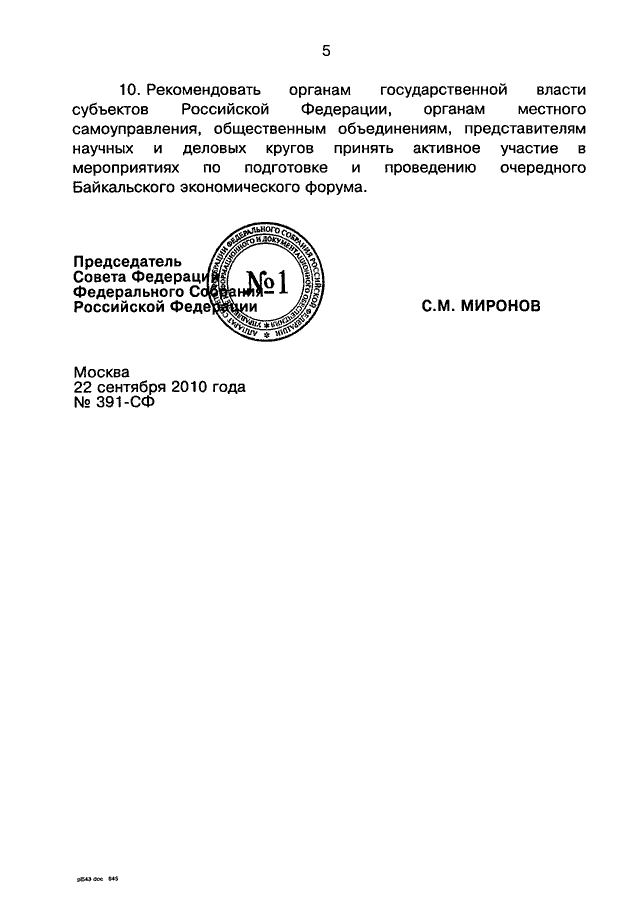ПОСТАНОВЛЕНИЕ СФ ФС РФ от 22.09.2010 N 391-СФ