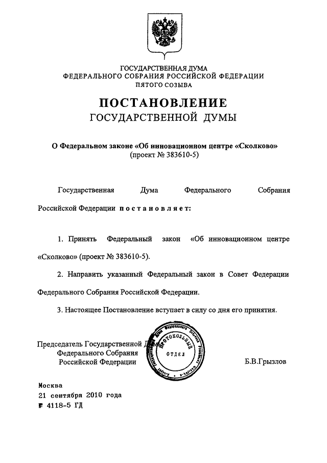 "О ФЕДЕРАЛЬНОМ ЗАКОНЕ "ОБ ИННОВАЦИОННОМ ЦЕНТРЕ "СКОЛКОВО" (ПРОЕКТ N 383610-5)"
