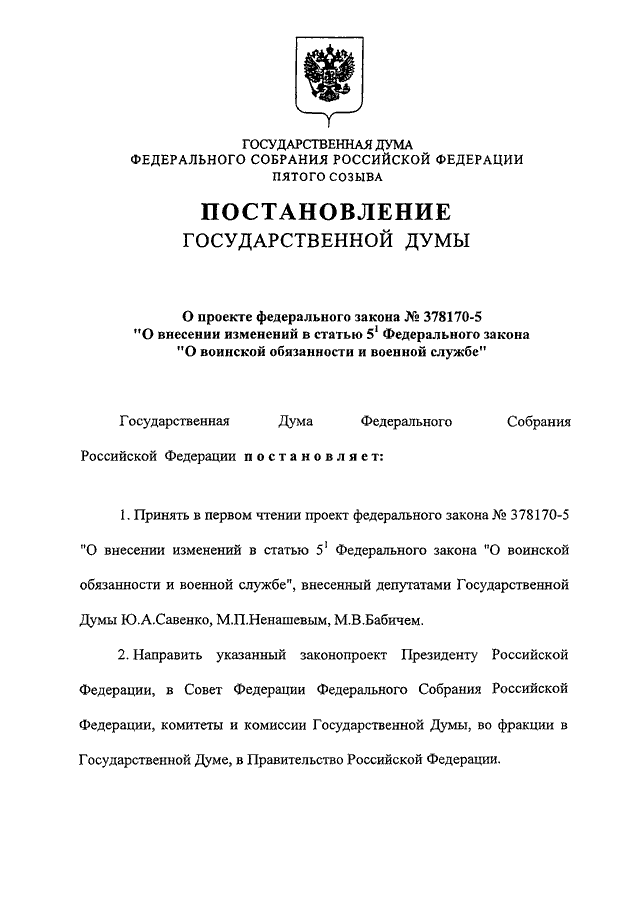 "О ПРОЕКТЕ ФЕДЕРАЛЬНОГО ЗАКОНА N 378170-5 "О ВНЕСЕНИИ ИЗМЕНЕНИЙ В СТАТЬЮ 5.1 ФЕДЕРАЛЬНОГО ЗАКОНА "О ВОИНСКОЙ ОБЯЗАННОСТИ И ВОЕННОЙ СЛУЖБЕ"