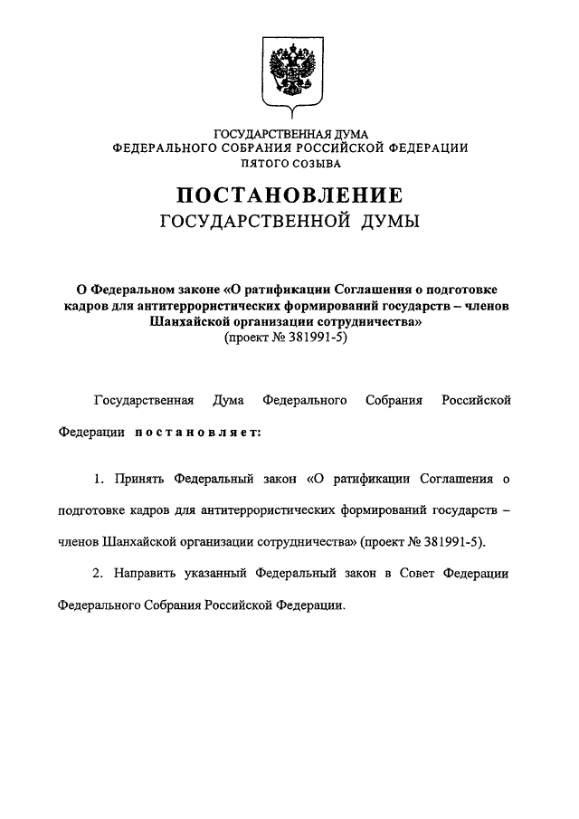 "О ФЕДЕРАЛЬНОМ ЗАКОНЕ "О РАТИФИКАЦИИ СОГЛАШЕНИЯ О ПОДГОТОВКЕ КАДРОВ ДЛЯ АНТИТЕРРОРИСТИЧЕСКИХ ФОРМИРОВАНИЙ ГОСУДАРСТВ - ЧЛЕНОВ ШАНХАЙСКОЙ ОРГАНИЗАЦИИ СОТРУДНИЧЕСТВА" (ПРОЕКТ N 381991-5)"