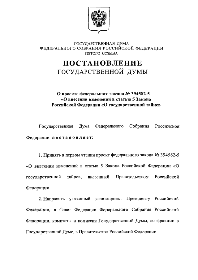 "О ПРОЕКТЕ ФЕДЕРАЛЬНОГО ЗАКОНА N 394582-5 "О ВНЕСЕНИИ ИЗМЕНЕНИЙ В СТАТЬЮ 5 ЗАКОНА РОССИЙСКОЙ ФЕДЕРАЦИИ "О ГОСУДАРСТВЕННОЙ ТАЙНЕ"