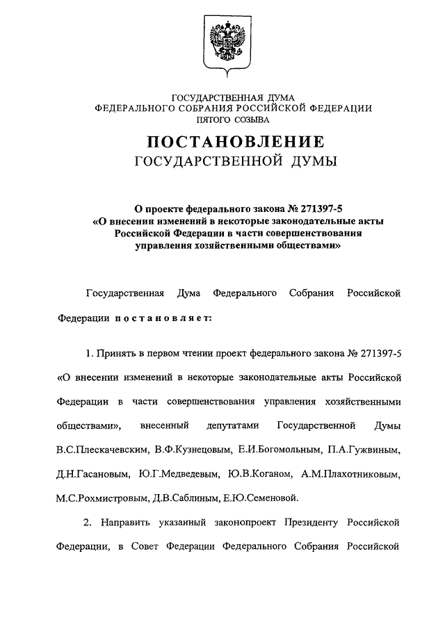 "О ПРОЕКТЕ ФЕДЕРАЛЬНОГО ЗАКОНА N 271397-5 "О ВНЕСЕНИИ ИЗМЕНЕНИЙ В НЕКОТОРЫЕ ЗАКОНОДАТЕЛЬНЫЕ АКТЫ РОССИЙСКОЙ ФЕДЕРАЦИИ В ЧАСТИ СОВЕРШЕНСТВОВАНИЯ УПРАВЛЕНИЯ ХОЗЯЙСТВЕННЫМИ ОБЩЕСТВАМИ"