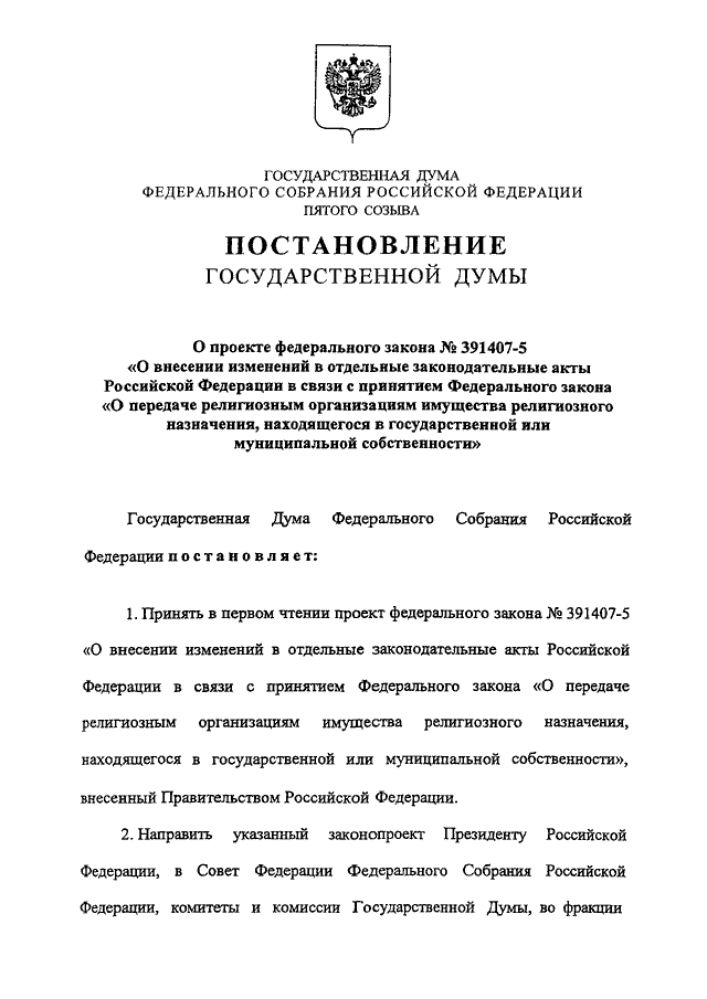 ПРИНЯТИЕМ ФЕДЕРАЛЬНОГО ЗАКОНА "О ПЕРЕДАЧЕ РЕЛИГИОЗНЫМ ОРГАНИЗАЦИЯМ