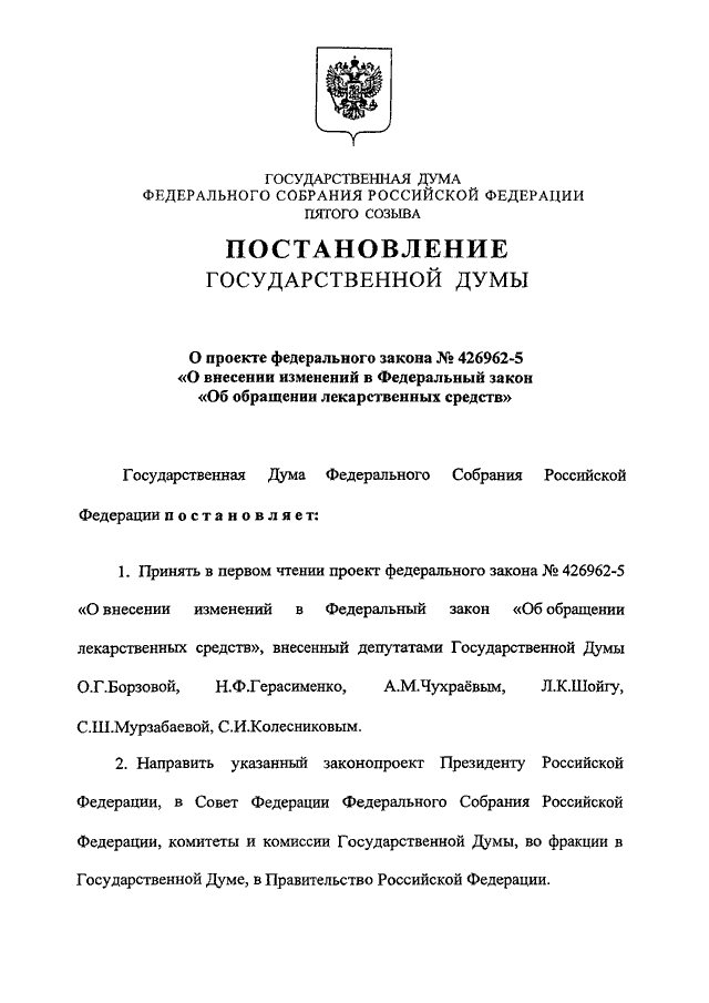 "О ПРОЕКТЕ ФЕДЕРАЛЬНОГО ЗАКОНА N 426962-5 "О ВНЕСЕНИИ ИЗМЕНЕНИЙ В ФЕДЕРАЛЬНЫЙ ЗАКОН "ОБ ОБРАЩЕНИИ ЛЕКАРСТВЕННЫХ СРЕДСТВ"