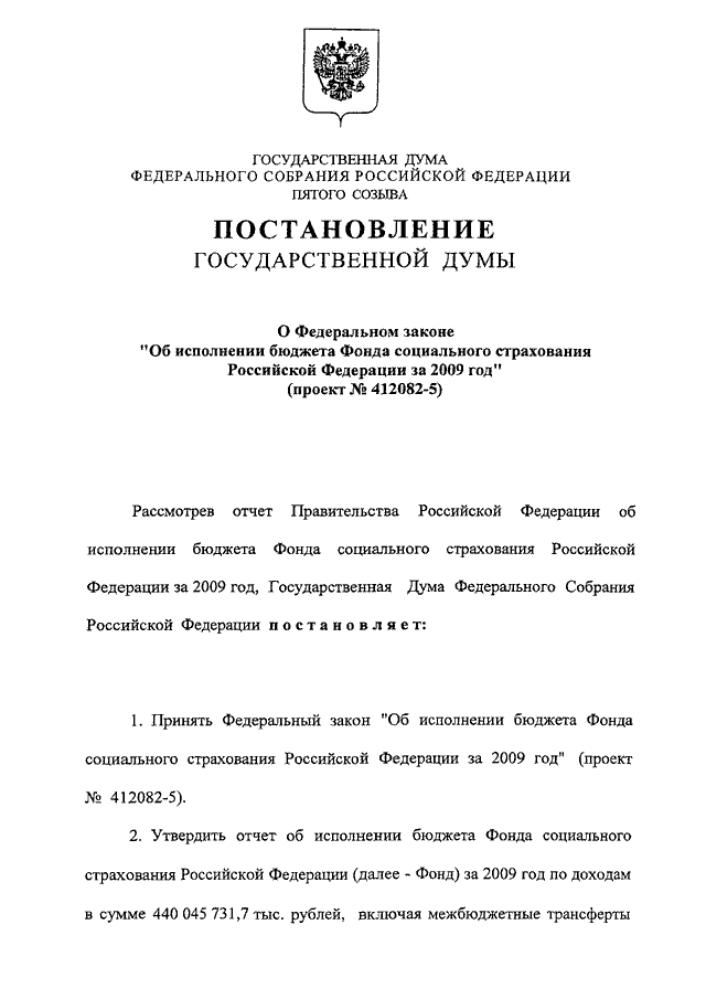 "О ФЕДЕРАЛЬНОМ ЗАКОНЕ "ОБ ИСПОЛНЕНИИ БЮДЖЕТА ФОНДА СОЦИАЛЬНОГО СТРАХОВАНИЯ РОССИЙСКОЙ ФЕДЕРАЦИИ ЗА 2009 ГОД" (ПРОЕКТ N 412082-5)"