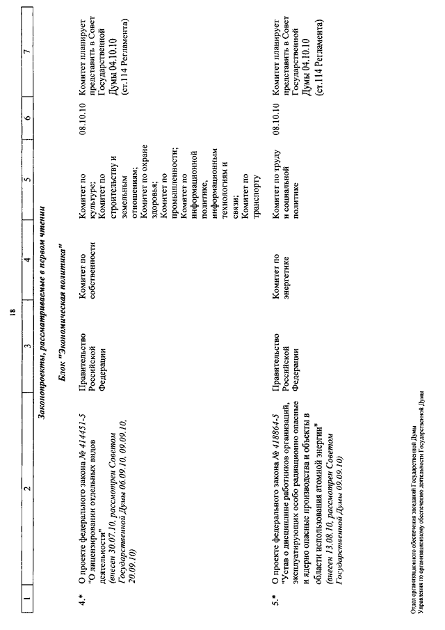 "О КАЛЕНДАРЕ РАССМОТРЕНИЯ ВОПРОСОВ ГОСУДАРСТВЕННОЙ ДУМОЙ С 5 ПО 22 ОКТЯБРЯ 2010 ГОДА"