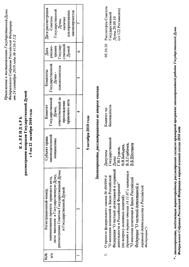 "О КАЛЕНДАРЕ РАССМОТРЕНИЯ ВОПРОСОВ ГОСУДАРСТВЕННОЙ ДУМОЙ С 5 ПО 22 ОКТЯБРЯ 2010 ГОДА"