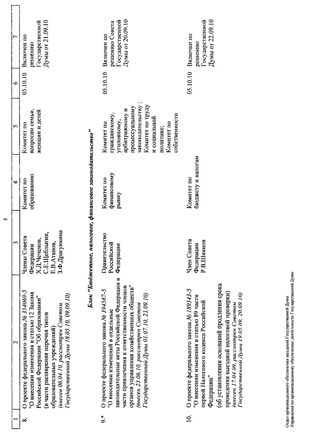 "О КАЛЕНДАРЕ РАССМОТРЕНИЯ ВОПРОСОВ ГОСУДАРСТВЕННОЙ ДУМОЙ С 5 ПО 22 ОКТЯБРЯ 2010 ГОДА"