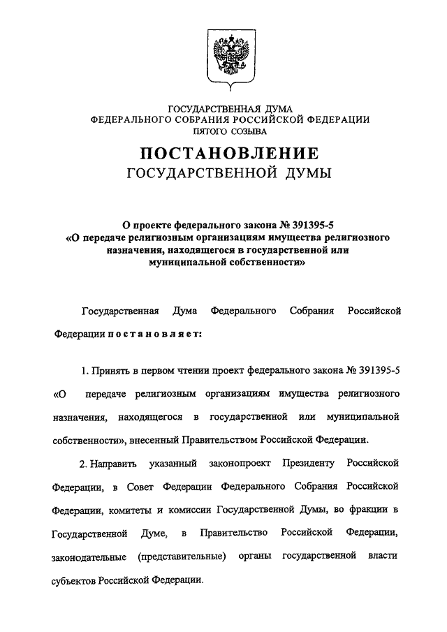 "О ПРОЕКТЕ ФЕДЕРАЛЬНОГО ЗАКОНА N 391395-5 "О ПЕРЕДАЧЕ РЕЛИГИОЗНЫМ ОРГАНИЗАЦИЯМ ИМУЩЕСТВА РЕЛИГИОЗНОГО НАЗНАЧЕНИЯ, НАХОДЯЩЕГОСЯ В ГОСУДАРСТВЕННОЙ ИЛИ МУНИЦИПАЛЬНОЙ СОБСТВЕННОСТИ"