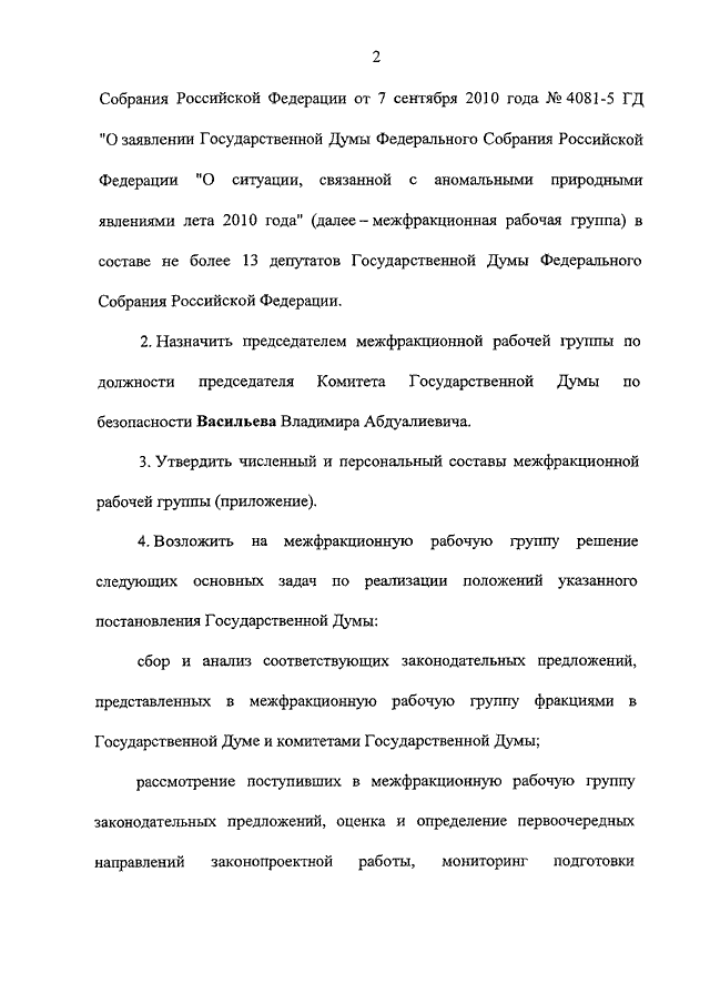 "О МЕЖФРАКЦИОННОЙ РАБОЧЕЙ ГРУППЕ ПО РЕАЛИЗАЦИИ ПОЛОЖЕНИЙ ПОСТАНОВЛЕНИЯ ГОСУДАРСТВЕННОЙ ДУМЫ ФЕДЕРАЛЬНОГО СОБРАНИЯ РОССИЙСКОЙ ФЕДЕРАЦИИ ОТ 7 СЕНТЯБРЯ 2010 Г. N 4081-5 ГД "О ЗАЯВЛЕНИИ ГОСУДАРСТВЕННОЙ ДУМЫ ФЕДЕРАЛЬНОГО СОБРАНИЯ РОССИЙСКОЙ ФЕДЕРАЦИИ "О СИТУАЦИИ, СВЯЗАННОЙ С АНОМАЛЬНЫМИ ПРИРОДНЫМИ ЯВЛЕНИЯМИ ЛЕТА 2010 ГОДА"