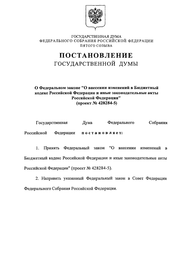 "О ФЕДЕРАЛЬНОМ ЗАКОНЕ "О ВНЕСЕНИИ ИЗМЕНЕНИЙ В БЮДЖЕТНЫЙ КОДЕКС РОССИЙСКОЙ ФЕДЕРАЦИИ И ИНЫЕ ЗАКОНОДАТЕЛЬНЫЕ АКТЫ РОССИЙСКОЙ ФЕДЕРАЦИИ" (ПРОЕКТ N 428284-5)"