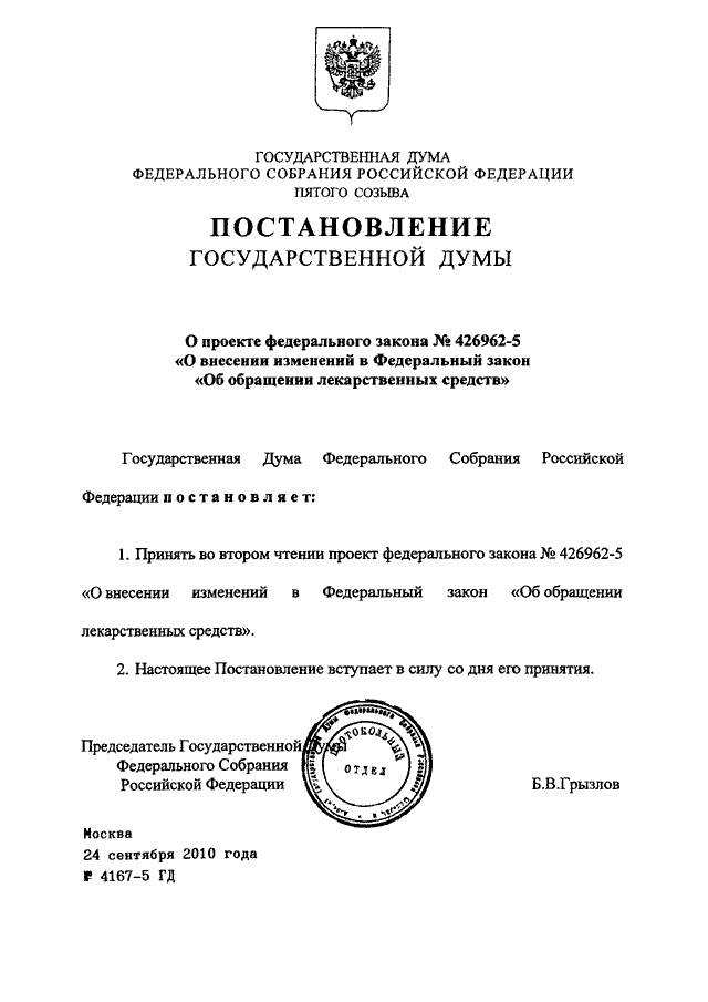 ПОСТАНОВЛЕНИЕ ГД ФС РФ от 24.09.2010 N 4167-5 ГД