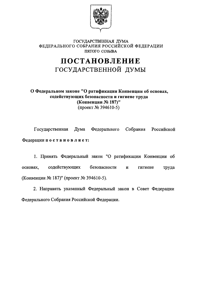 "О ФЕДЕРАЛЬНОМ ЗАКОНЕ "О РАТИФИКАЦИИ КОНВЕНЦИИ ОБ ОСНОВАХ, СОДЕЙСТВУЮЩИХ БЕЗОПАСНОСТИ И ГИГИЕНЕ ТРУДА (КОНВЕНЦИИ N 187)" (ПРОЕКТ N 394610-5)"