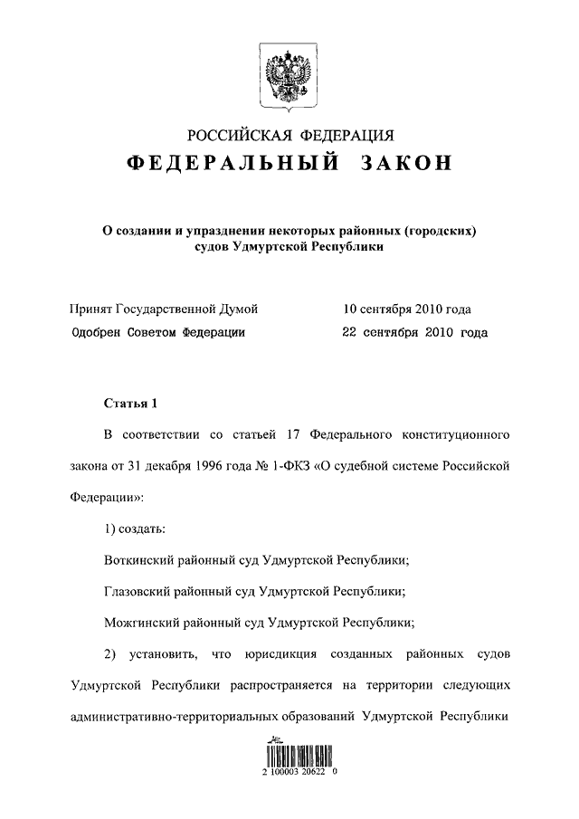 "О СОЗДАНИИ И УПРАЗДНЕНИИ НЕКОТОРЫХ РАЙОННЫХ (ГОРОДСКИХ) СУДОВ УДМУРТСКОЙ РЕСПУБЛИКИ"