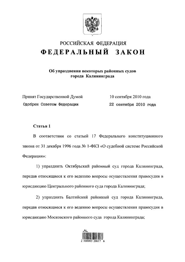 "ОБ УПРАЗДНЕНИИ НЕКОТОРЫХ РАЙОННЫХ СУДОВ ГОРОДА КАЛИНИНГРАДА"