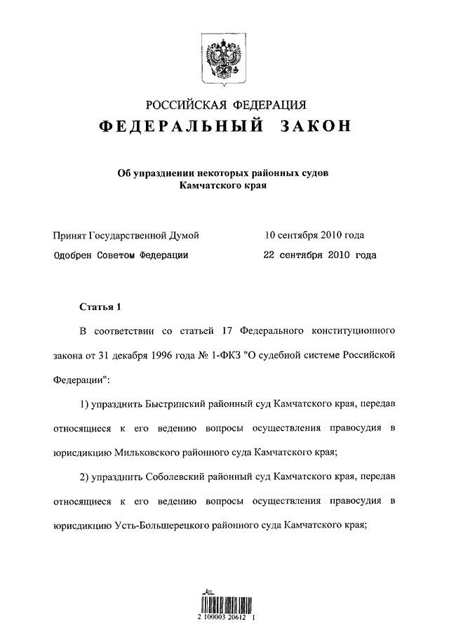 "ОБ УПРАЗДНЕНИИ НЕКОТОРЫХ РАЙОННЫХ СУДОВ КАМЧАТСКОГО КРАЯ"