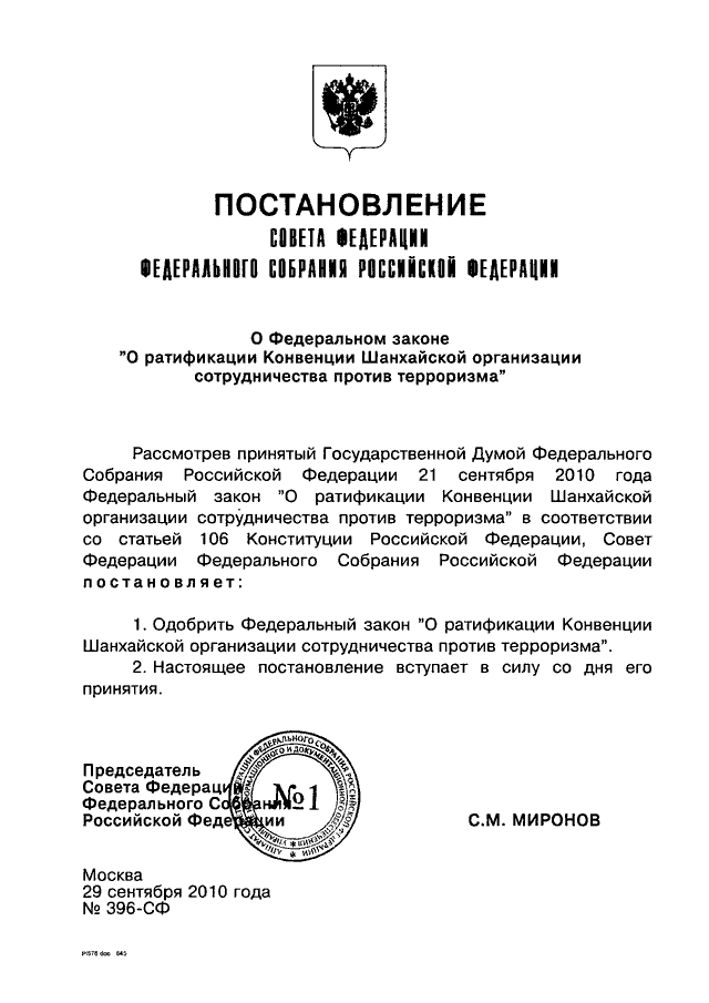 ПОСТАНОВЛЕНИЕ СФ ФС РФ от 29.09.2010 N 396-СФ