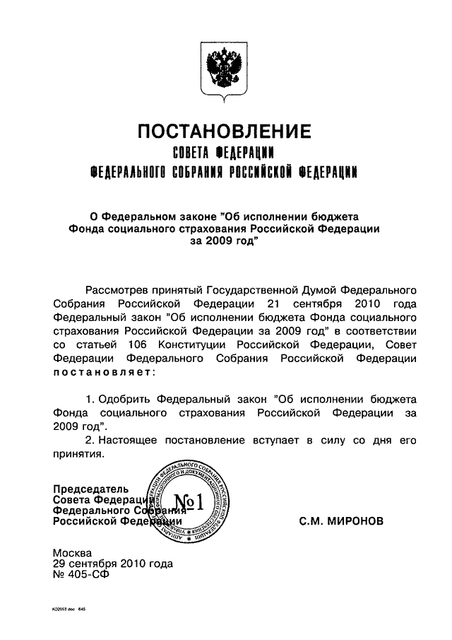 ПОСТАНОВЛЕНИЕ СФ ФС РФ от 29.09.2010 N 405-СФ