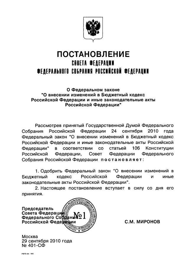 ПОСТАНОВЛЕНИЕ СФ ФС РФ от 29.09.2010 N 401-СФ