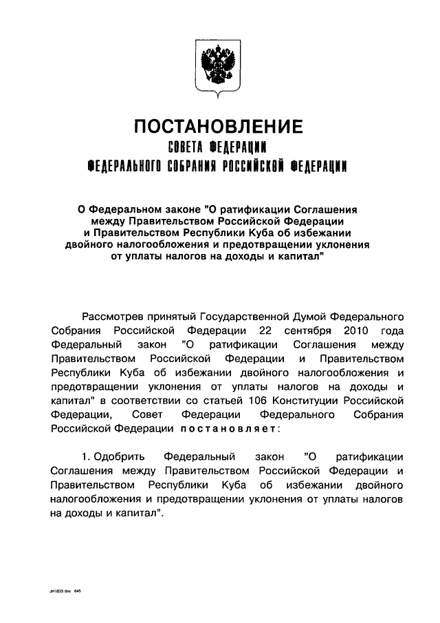 "О ФЕДЕРАЛЬНОМ ЗАКОНЕ "О РАТИФИКАЦИИ СОГЛАШЕНИЯ МЕЖДУ ПРАВИТЕЛЬСТВОМ РОССИЙСКОЙ ФЕДЕРАЦИИ И ПРАВИТЕЛЬСТВОМ РЕСПУБЛИКИ КУБА ОБ ИЗБЕЖАНИИ ДВОЙНОГО НАЛОГООБЛОЖЕНИЯ И ПРЕДОТВРАЩЕНИИ УКЛОНЕНИЯ ОТ УПЛАТЫ НАЛОГОВ НА ДОХОДЫ И КАПИТАЛ"