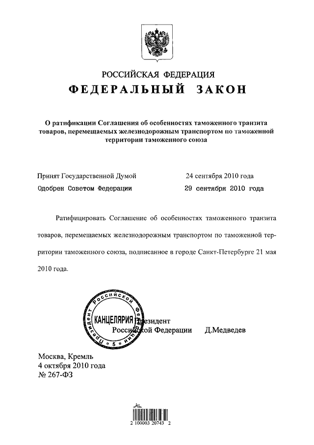 ФЕДЕРАЛЬНЫЙ ЗАКОН от 04.10.2010 N 267-ФЗ
