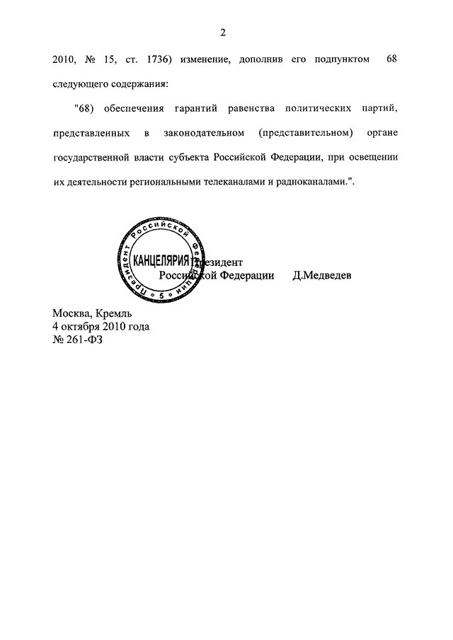 ФЕДЕРАЛЬНЫЙ ЗАКОН от 04.10.2010 N 261-ФЗ