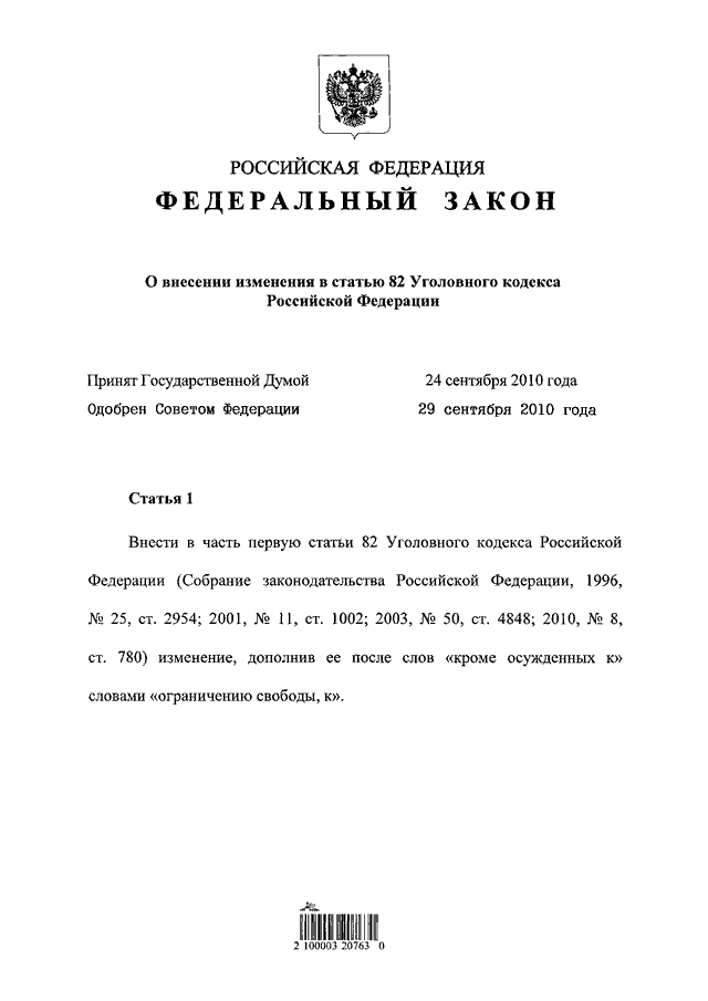 "О ВНЕСЕНИИ ИЗМЕНЕНИЯ В СТАТЬЮ 82 УГОЛОВНОГО КОДЕКСА РОССИЙСКОЙ ФЕДЕРАЦИИ"