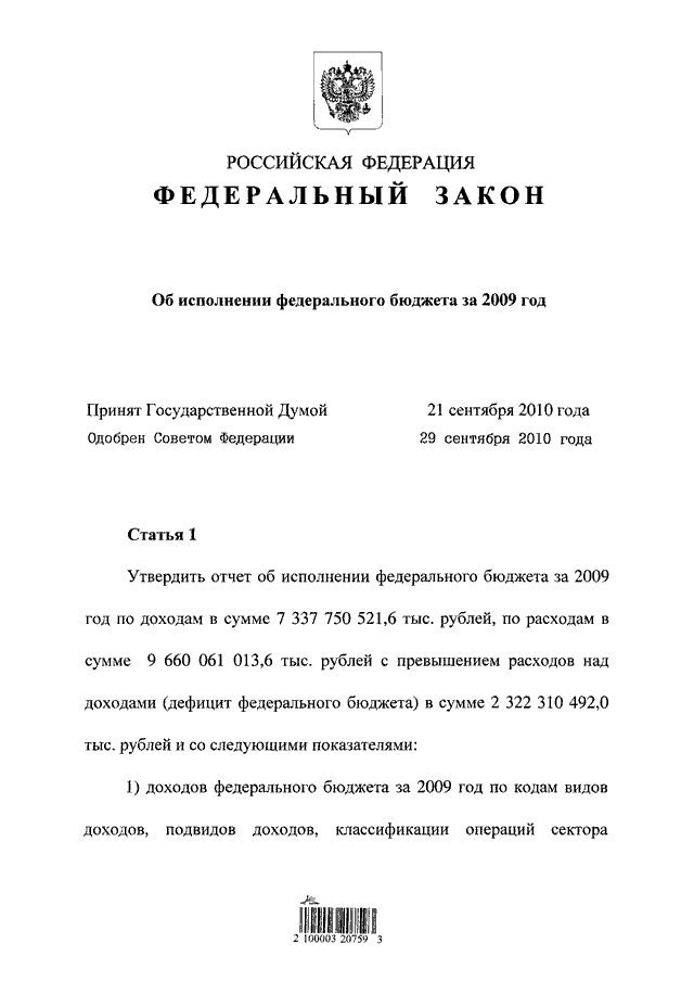 "ОБ ИСПОЛНЕНИИ ФЕДЕРАЛЬНОГО БЮДЖЕТА ЗА 2009 ГОД"