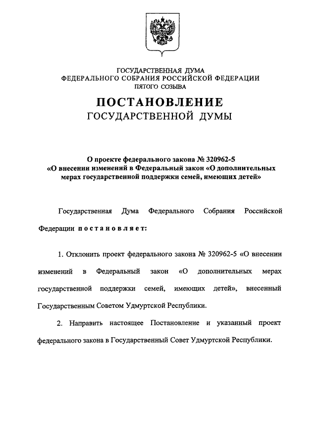 "О ПРОЕКТЕ ФЕДЕРАЛЬНОГО ЗАКОНА N 320962-5 "О ВНЕСЕНИИ ИЗМЕНЕНИЙ В ФЕДЕРАЛЬНЫЙ ЗАКОН "О ДОПОЛНИТЕЛЬНЫХ МЕРАХ ГОСУДАРСТВЕННОЙ ПОДДЕРЖКИ СЕМЕЙ, ИМЕЮЩИХ ДЕТЕЙ"