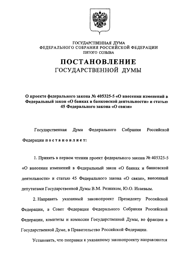 "О ПРОЕКТЕ ФЕДЕРАЛЬНОГО ЗАКОНА N 405325-5 "О ВНЕСЕНИИ ИЗМЕНЕНИЙ В ФЕДЕРАЛЬНЫЙ ЗАКОН "О БАНКАХ И БАНКОВСКОЙ ДЕЯТЕЛЬНОСТИ" И СТАТЬЮ 45 ФЕДЕРАЛЬНОГО ЗАКОНА "О СВЯЗИ"