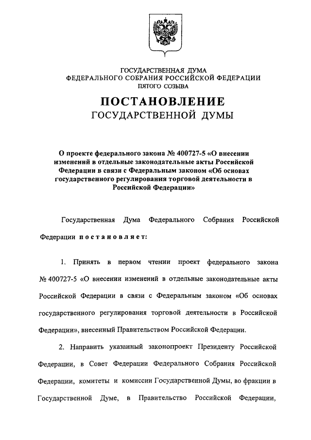 "О ПРОЕКТЕ ФЕДЕРАЛЬНОГО ЗАКОНА N 400727-5 "О ВНЕСЕНИИ ИЗМЕНЕНИЙ В ОТДЕЛЬНЫЕ ЗАКОНОДАТЕЛЬНЫЕ АКТЫ РОССИЙСКОЙ ФЕДЕРАЦИИ В СВЯЗИ С ФЕДЕРАЛЬНЫМ ЗАКОНОМ "ОБ ОСНОВАХ ГОСУДАРСТВЕННОГО РЕГУЛИРОВАНИЯ ТОРГОВОЙ ДЕЯТЕЛЬНОСТИ В РОССИЙСКОЙ ФЕДЕРАЦИИ"
