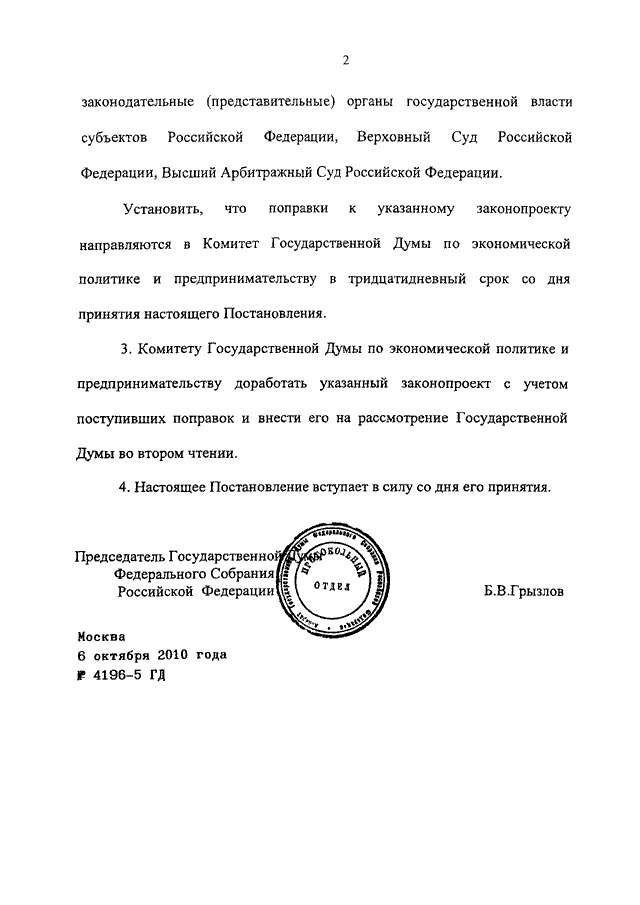 ПОСТАНОВЛЕНИЕ ГД ФС РФ от 06.10.2010 N 4196-5 ГД