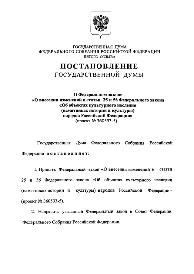 "О ФЕДЕРАЛЬНОМ ЗАКОНЕ "О ВНЕСЕНИИ ИЗМЕНЕНИЙ В СТАТЬИ 25 И 56 ФЕДЕРАЛЬНОГО ЗАКОНА "ОБ ОБЪЕКТАХ КУЛЬТУРНОГО НАСЛЕДИЯ (ПАМЯТНИКАХ ИСТОРИИ И КУЛЬТУРЫ) НАРОДОВ РОССИЙСКОЙ ФЕДЕРАЦИИ" (ПРОЕКТ N 360593-5)"