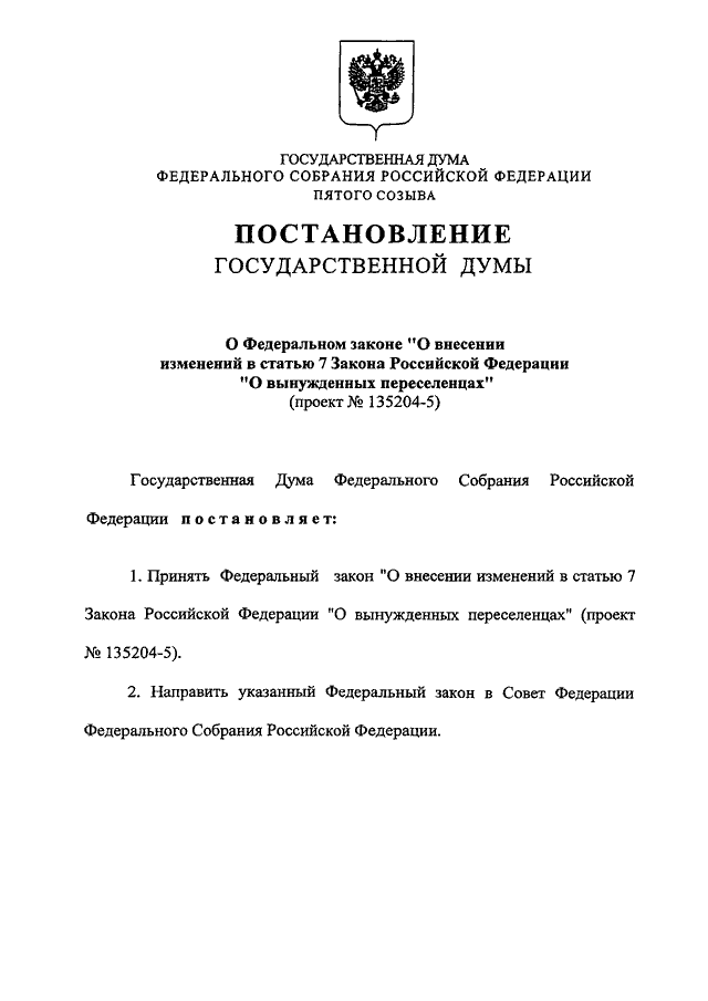"О ФЕДЕРАЛЬНОМ ЗАКОНЕ "О ВНЕСЕНИИ ИЗМЕНЕНИЙ В СТАТЬЮ 7 ЗАКОНА РОССИЙСКОЙ ФЕДЕРАЦИИ "О ВЫНУЖДЕННЫХ ПЕРЕСЕЛЕНЦАХ" (ПРОЕКТ N 135204-5)"