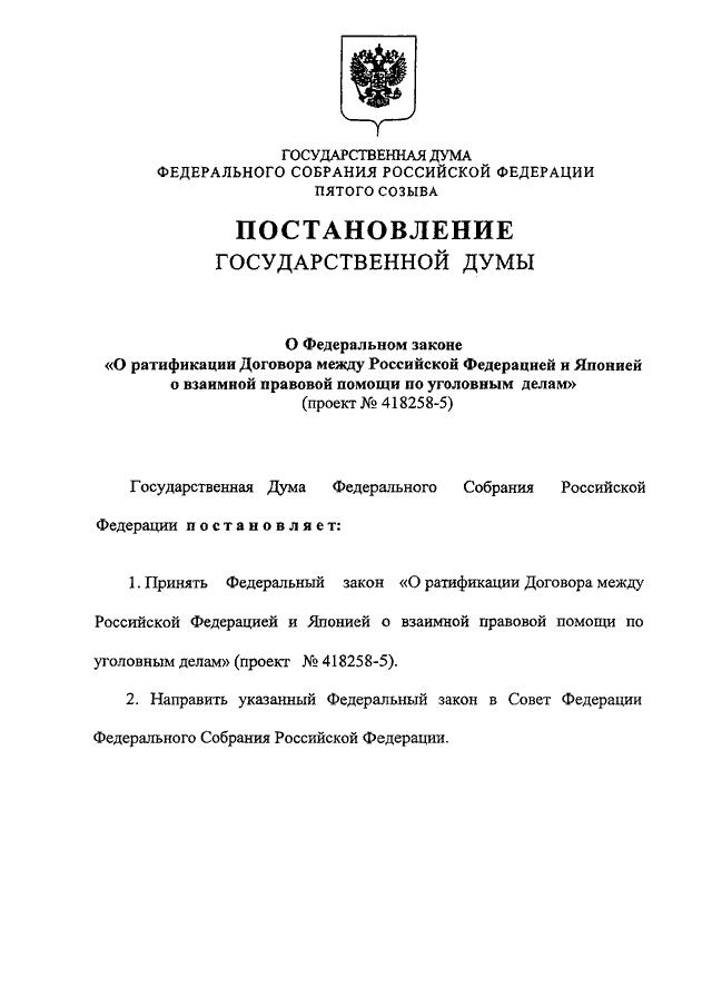 "О ФЕДЕРАЛЬНОМ ЗАКОНЕ "О РАТИФИКАЦИИ ДОГОВОРА МЕЖДУ РОССИЙСКОЙ ФЕДЕРАЦИЕЙ И ЯПОНИЕЙ О ВЗАИМНОЙ ПРАВОВОЙ ПОМОЩИ ПО УГОЛОВНЫМ ДЕЛАМ" (ПРОЕКТ N 418258-5)"