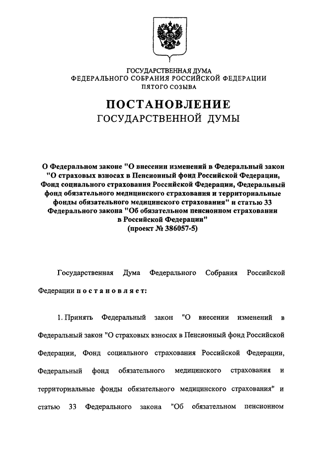 "О ФЕДЕРАЛЬНОМ ЗАКОНЕ "О ВНЕСЕНИИ ИЗМЕНЕНИЙ В ФЕДЕРАЛЬНЫЙ ЗАКОН "О СТРАХОВЫХ ВЗНОСАХ В ПЕНСИОННЫЙ ФОНД РОССИЙСКОЙ ФЕДЕРАЦИИ, ФОНД СОЦИАЛЬНОГО СТРАХОВАНИЯ РОССИЙСКОЙ ФЕДЕРАЦИИ, ФЕДЕРАЛЬНЫЙ ФОНД ОБЯЗАТЕЛЬНОГО МЕДИЦИНСКОГО СТРАХОВАНИЯ И ТЕРРИТОРИАЛЬНЫЕ ФОНДЫ ОБЯЗАТЕЛЬНОГО МЕДИЦИНСКОГО СТРАХОВАНИЯ" И СТАТЬЮ 33 ФЕДЕРАЛЬНОГО ЗАКОНА "ОБ ОБЯЗАТЕЛЬНОМ ПЕНСИОННОМ СТРАХОВАНИИ В РОССИЙСКОЙ ФЕДЕРАЦИИ" (ПРОЕКТ N 386057-5)"