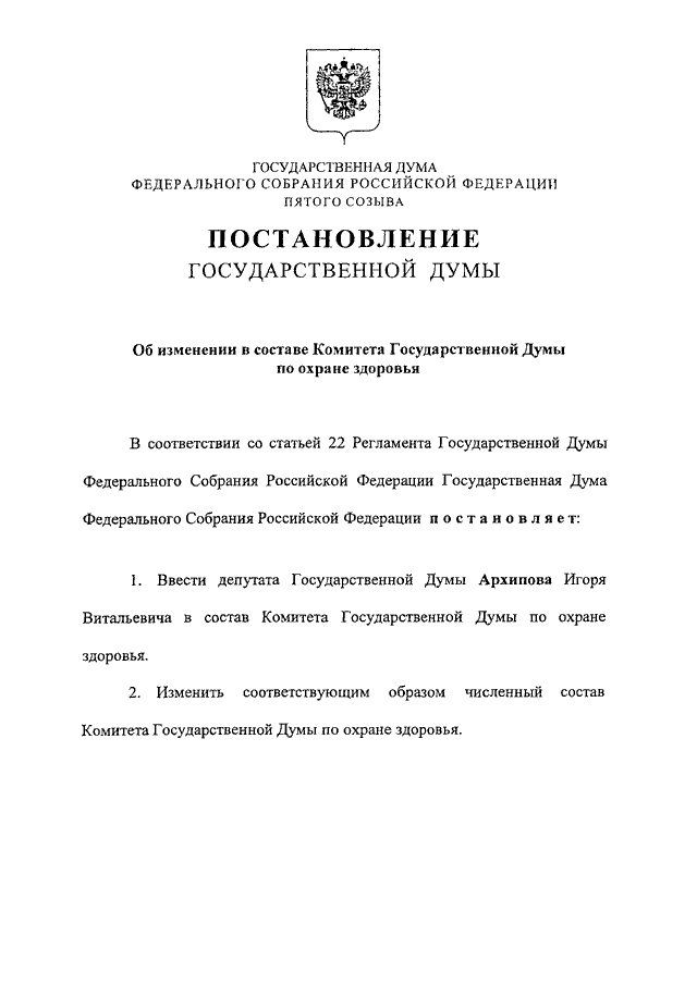 "ОБ ИЗМЕНЕНИИ В СОСТАВЕ КОМИТЕТА ГОСУДАРСТВЕННОЙ ДУМЫ ПО ОХРАНЕ ЗДОРОВЬЯ"