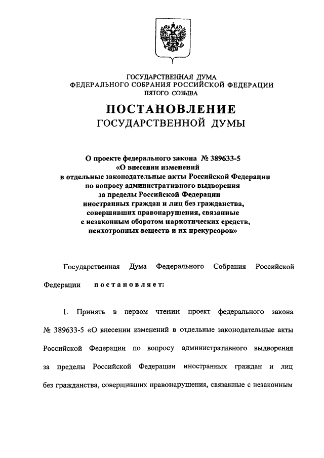 "О ПРОЕКТЕ ФЕДЕРАЛЬНОГО ЗАКОНА N 389633-5 "О ВНЕСЕНИИ ИЗМЕНЕНИЙ В ОТДЕЛЬНЫЕ ЗАКОНОДАТЕЛЬНЫЕ АКТЫ РОССИЙСКОЙ ФЕДЕРАЦИИ ПО ВОПРОСУ АДМИНИСТРАТИВНОГО ВЫДВОРЕНИЯ ЗА ПРЕДЕЛЫ РОССИЙСКОЙ ФЕДЕРАЦИИ ИНОСТРАННЫХ ГРАЖДАН И ЛИЦ БЕЗ ГРАЖДАНСТВА, СОВЕРШИВШИХ ПРАВОНАРУШЕНИЯ, СВЯЗАННЫЕ С НЕЗАКОННЫМ ОБОРОТОМ НАРКОТИЧЕСКИХ СРЕДСТВ, ПСИХОТРОПНЫХ ВЕЩЕСТВ И ИХ ПРЕКУРСОРОВ"
