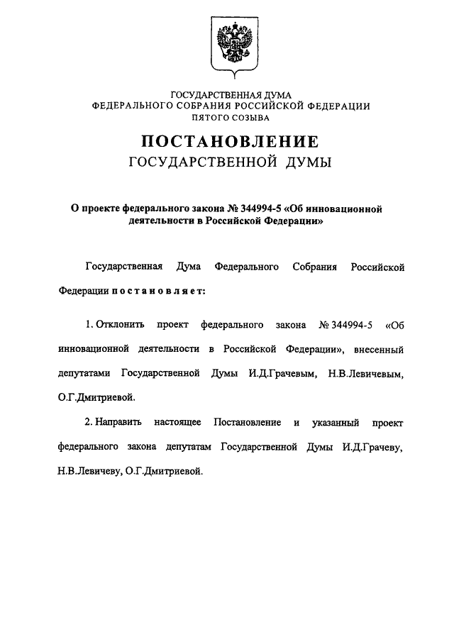 "О ПРОЕКТЕ ФЕДЕРАЛЬНОГО ЗАКОНА N 344994-5 "ОБ ИННОВАЦИОННОЙ ДЕЯТЕЛЬНОСТИ В РОССИЙСКОЙ ФЕДЕРАЦИИ"