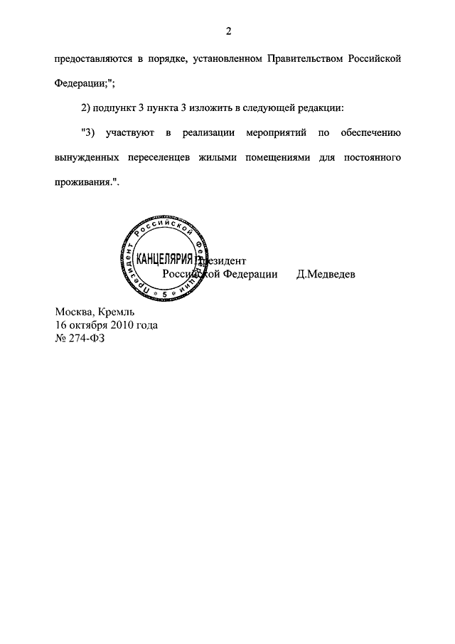 ФЕДЕРАЛЬНЫЙ ЗАКОН от 16.10.2010 N 274-ФЗ