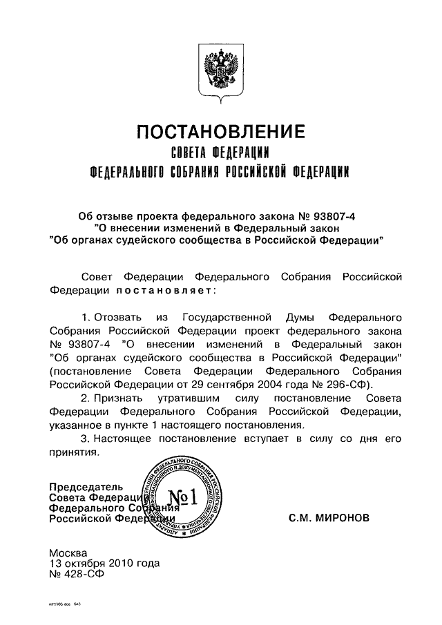 ПОСТАНОВЛЕНИЕ СФ ФС РФ от 13.10.2010 N 428-СФ