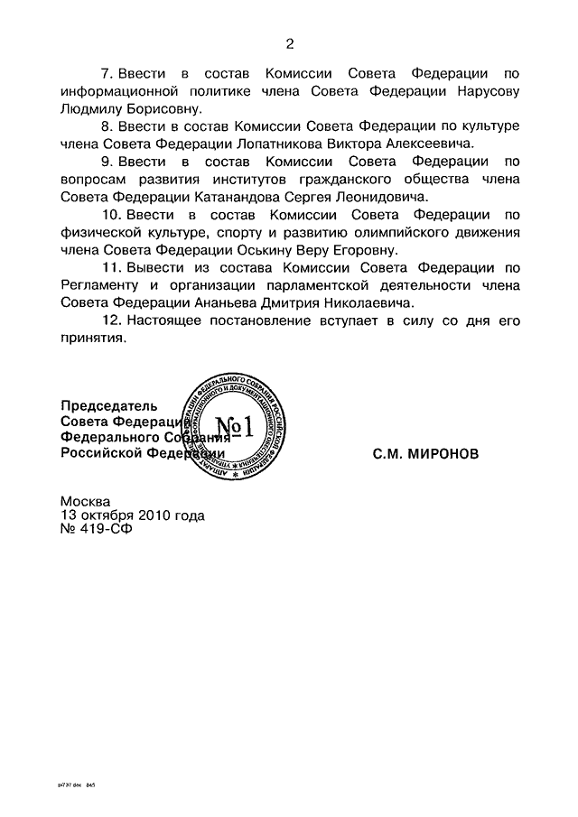 ПОСТАНОВЛЕНИЕ СФ ФС РФ от 13.10.2010 N 419-СФ