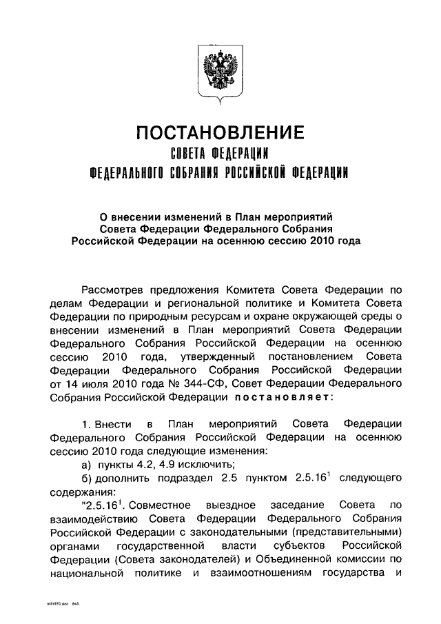 "О ВНЕСЕНИИ ИЗМЕНЕНИЙ В ПЛАН МЕРОПРИЯТИЙ СОВЕТА ФЕДЕРАЦИИ ФЕДЕРАЛЬНОГО СОБРАНИЯ РОССИЙСКОЙ ФЕДЕРАЦИИ НА ОСЕННЮЮ СЕССИЮ 2010 ГОДА"