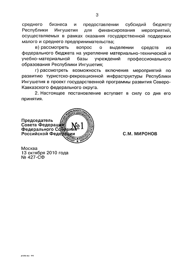 ПОСТАНОВЛЕНИЕ СФ ФС РФ от 13.10.2010 N 427-СФ