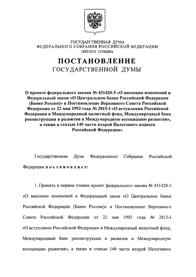 "О ПРОЕКТЕ ФЕДЕРАЛЬНОГО ЗАКОНА N 431420-5 "О ВНЕСЕНИИ ИЗМЕНЕНИЙ В