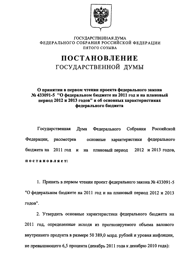 "О ПРИНЯТИИ В ПЕРВОМ ЧТЕНИИ ПРОЕКТА ФЕДЕРАЛЬНОГО ЗАКОНА N 433091-5 "О ФЕДЕРАЛЬНОМ БЮДЖЕТЕ НА 2011 ГОД И НА ПЛАНОВЫЙ ПЕРИОД 2012 И 2013 ГОДОВ" И ОБ ОСНОВНЫХ ХАРАКТЕРИСТИКАХ ФЕДЕРАЛЬНОГО БЮДЖЕТА"
