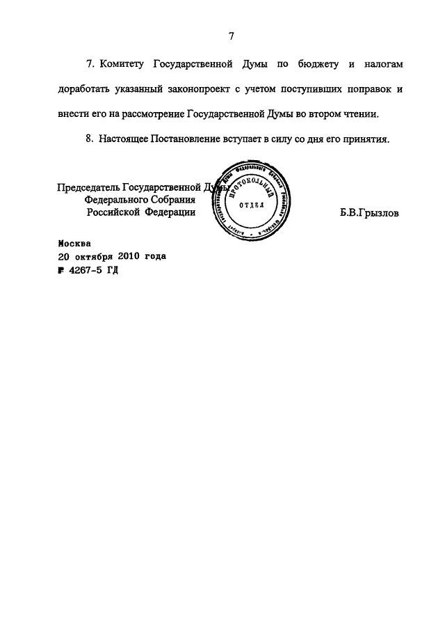 ПОСТАНОВЛЕНИЕ ГД ФС РФ от 20.10.2010 N 4267-5 ГД