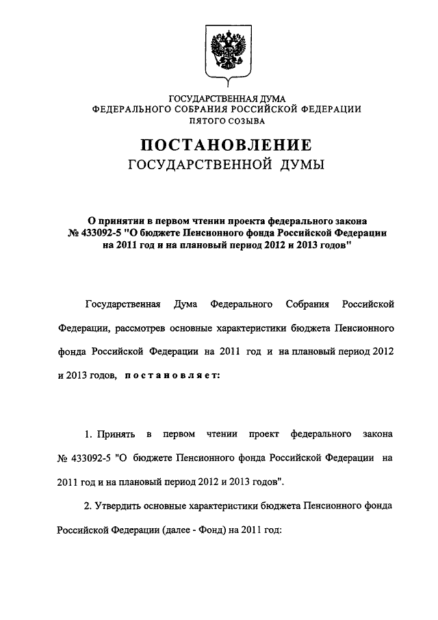 "О ПРИНЯТИИ В ПЕРВОМ ЧТЕНИИ ПРОЕКТА ФЕДЕРАЛЬНОГО ЗАКОНА N 433092-5 "О БЮДЖЕТЕ ПЕНСИОННОГО ФОНДА РОССИЙСКОЙ ФЕДЕРАЦИИ НА 2011 ГОД И НА ПЛАНОВЫЙ ПЕРИОД 2012 И 2013 ГОДОВ"